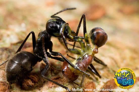 莫菲特在书中描述了蚂蚁如何以戏剧性的自杀方式来抵御外敌侵害的情景。在婆罗洲,莫菲特在一个树干上涂抹了香甜的蜂蜜,并在附近藏好一台摄像机。