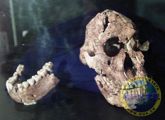 傍人“罗百氏”(Paranthropus robustus)头骨和牙齿的化石