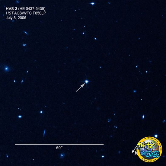 这张哈勃望远镜的图像显示超高速恒星HE 0437-5439的位置(图上用箭头标出的目标),它正高速逃离银河系