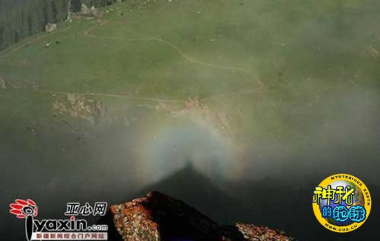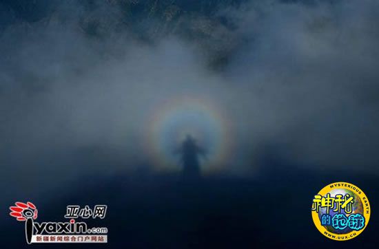 他说,当天半山腰的雾气很重,大约在18时50分,他突然看到半山腰斜向下45°角的位置出现了一个红、橙、黄、绿、青、蓝、紫的七色光环,不过第一次出现非常短暂,还不到半分钟。“半个小时后,我们都登上了山,山上阳光明媚,但俯身看山下,半山腰却依然雾气重重,就在这个时候‘佛光’又出现了,很清晰,光环中间我们的人影都能看得清楚,于是大家摆出千手观音的样子,投射在光环之中。”