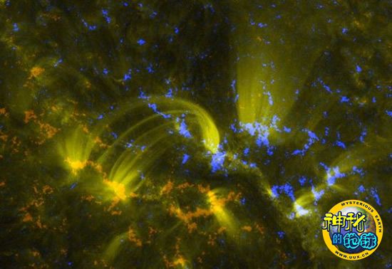 这是7月16日公布的、由美国宇航局太阳动力天文台的观测数据所形成的合成图。图中,来自太阳的远紫外线形成了一组组弧形光线,而且向相反电荷区域延伸。太阳动力天文台携带了三种主要科学仪器,如日震及磁场成像仪、远紫外线变化实验仪和大气成像组件。日震及磁场成像仪显示的蓝色和橙色区域,表明该区域磁场拥有相反电荷。大气成像组件提供了关于太阳紫外线的数据。美国宇航局科学家介绍说,远紫外线形成并列的弧形光线,表明该区域的磁场更强。