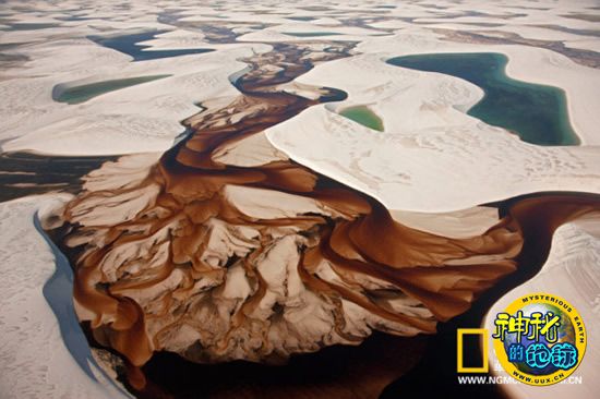 从空中俯瞰,连绵的沙丘就像起风的下午晾起来风干的一块块白色亚麻布。实际上,这片区域的名称——“拉克依斯马拉赫塞斯”,意思就是“马拉尼昂州的床单”。马拉尼昂州位于巴西东北部的热带海岸,座座半月形的沙丘就分布在这里。不论冠名如何,这里都是一片充满魔幻色彩的沙漠,一波波闪着微光的白色沙浪绵延铺展。雨水汇集成的耀眼的蓝绿色池塘中,游着银光闪闪的鱼群。牧羊人赶着羊群翻越高耸的沙丘,渔夫出海打渔,为他们指路的只有天空繁星和沉船残骸中的幽灵。