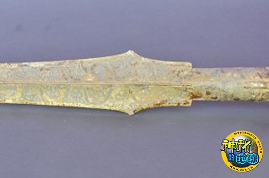 考古队长李则斌向记者展示了其中一件铜铍,带刃的前端类似短剑,长约30厘米。虽然距今至少已有2100年,但其铍尖和锋刃没有任何缺损,黑色的铍身仍泛出幽暗的光芒。令人惊叹之处在于铍身上的暗花纹,这些黑色卷云纹清晰可见,用手抚摸却丝毫感觉不到。暗花纹是指在极少数精致的剑、戈、矛上所饰的菱形、米字形及火焰状几何装饰,仅见于春秋战国时期吴越地区所出兵器之上。由于发现量极少,加之目前技术上对暗花纹尚无法完全复制,这些花纹究竟是怎么形成的,至今仍然是个谜。一种观点认为暗花纹采用了合金热扩散原理,即用锡基和金粉末涂兵器表面,经加热使合金成分渗入兵器中,使涂敷部分成白色,未涂部分仍为铜黄色;还有一种观点认为,采用了硫化铜的工艺,花纹处含硫量高,硫化铜可防腐,这也许是兵器保存完好的原因之一。