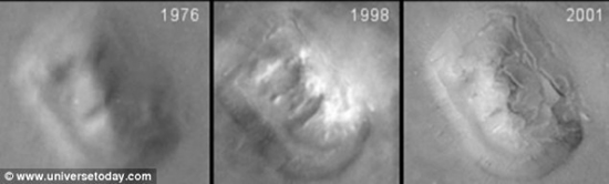 由于太阳的角度以及坑坑洼洼的表面,那片露出表面的岩层看上去与人脸确实有些相似之处,有眼睛、耳朵和嘴巴,美宇航局便欣然指出了这种相似之处。美宇航局当时发表的声明称:“这张照片是正在为‘海盗二号’寻找着陆点的‘海盗一号’探测器在火星北纬地区拍到的许多照片之一,显示了像平顶山一样的遭侵蚀的地形。”