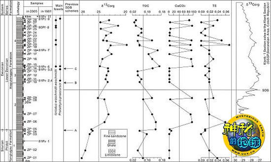 近5年来,中科院古脊椎所赵文金博士所领导的课题组与德国于利希研究中心岩石圈化学与动力学研究所Ulrich Mann博士所领导的课题组一直致力于中国志留系/泥盆系界线剖面的研究,最近他们通过地球化学的方法和手段,探讨了西秦岭地区普通沟剖面和羊路沟剖面中的志留系/泥盆系界线,并基本上解决了该地区志留系/泥盆系界线问题。依据地球化学指标的综合对比分析, 初步确定西秦岭地区四川若尔盖普通沟剖面中的志留系/泥盆系界线大体上位于下普通沟组底部,即样品ZP09与ZP10之间(图),而羊路沟剖面中的志留系/泥盆系界线则大体上位于羊路沟组顶部,即样品ZY06与ZY07之间,这与前人依据各种古生物化石所确定的S/D界线基本吻合。志留系/泥盆系界线附近化学地层学工作的开展不仅填补了我国志留纪及泥盆纪地层学在这一研究领域的空白,而且为我国不同地区志留系/泥盆系界线的确定及界线附近地层的洲际对比提供了一套全新的解决方案,并将进一步推动当前国际上志留系/泥盆系界线地层学的研究。