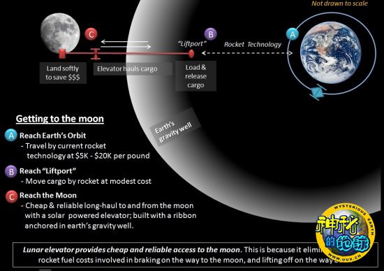 基于地面的太空梯基本上就是一条长长的缆绳——也许长达6.2万英里(约合10万公里),一端固定在地球上,另一端固定在地球同步轨道的平衡物(如大卫星)上。在引力和向心加速度的作用下,缆绳或丝带可以保持僵硬,小电梯或“升降机”可以向上移动太空梯,而耗费的能量和费用仅是将物体发射到轨道的极小部分。