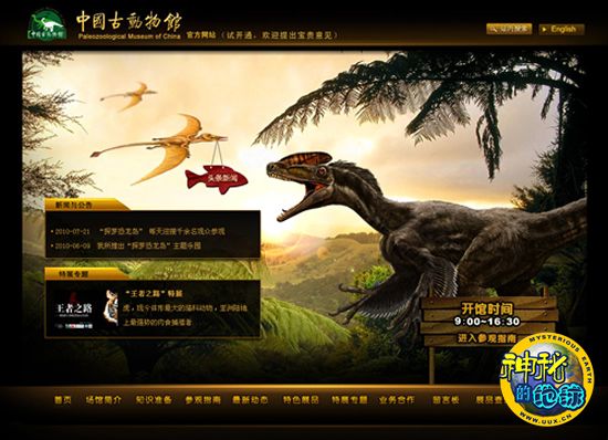 点击http://www.paleozoo.cn/,或者http://www.paleozoo.com.cn,即可进入经过精心设计的官网首页,网站包括场馆简介、知识准备、参观指南、最新动态、特色展品、特展专题、俱乐部等栏目,也有博物馆对外开展外展巡展和模型制作业务的对外合作介绍,以及方便实用的展品查询。