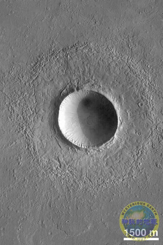 This Martian crater in the planet's northern Elysium Planitia—a volcanic area—is a little more than twice the diameter of the crater that would result from an asteroid hit in January 2008.
