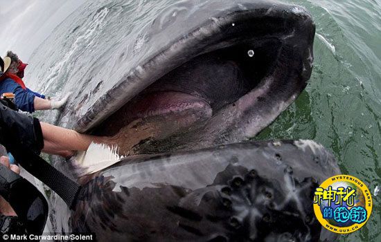 墨西哥的圣伊格纳西奥环礁湖,一头成年灰鲸正享受游人胳肢它的舌头。
