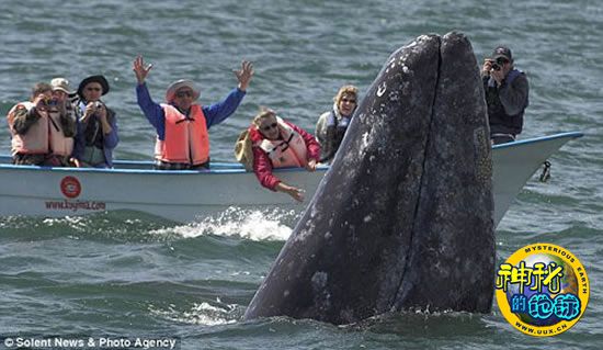 图片中的成年灰鲸身长45英尺(约合13.71米),非常愿意游人胳肢它们的后背和舌头。此外,灰鲸还鼓励幼仔与船只亲密接触。如果渴望被人爱抚的想法遭人忽视,它们会游向更多游客,希望能够引起他们的注意。这是一群喜欢搞恶作剧的鲸鱼,它们甚至会游到船下面而后将船顶出水面,吓游客一跳。