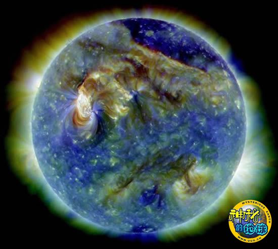 正如这张由太阳动力学观测台拍摄的照片显示,太阳的发光旋转物(图像中央左侧)标出了等离子体流释放8月1日日冕物质抛射的位置。那次日冕物质抛射引发了上周壮观的极光现象。不同的颜色显示了太阳具有温度差异的地区。太阳活动周期是太阳黑子数及其他现象的准周期变化,大约11年为一个周期。上一个太阳活动高峰期结束于2001年,随后进入长期的静默期。连同最新活动频繁的太阳黑子,8月份的日冕物质抛射似乎是太阳重新觉醒的迹象,这对极光迷来说是个好消息,但却会给卫星、宇航员和部分地面设施带来潜在麻烦。