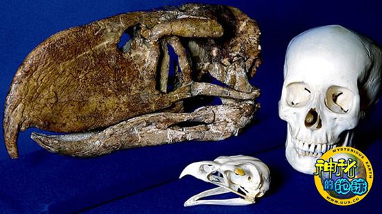 “恐怖鸟”的头骨化石与鹫、人类的头骨模型进行大小对比