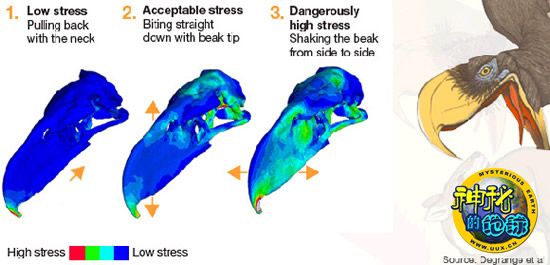 因为今天地球上没有类似“恐怖鸟”的物种,因此很难确定它们的生活习性。为此,科学家检验了一种与“恐怖鸟”类似的骇鸟骨骼,并利用“有限元分析”的科学方法制造出这种鸟的计算机骨骼模型,试验这种鸟类不同的攻击行为。