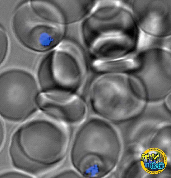 显微镜图像展示了T3.5如何存在于将红血球感染的疟原虫中。