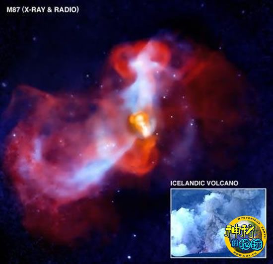 据美国物理学组织网报道,日前,美国宇航局“钱德拉”X射线天文台和甚大阵射电望远镜拍摄到超大星系M87呈现出壮观的“星系超级火山”景象。