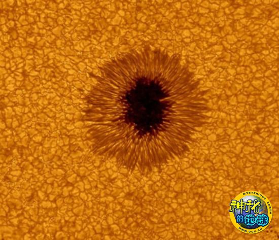 该太阳黑子中心区域的温度约为3600度,而边缘地区则要热的多,超过5800度。黑子周围大量形状不规则的物体称为“米粒组织”,是太阳内部上涌的炙热气体形成的。每一个这样的米粒组织单元直径大约1000公里。
