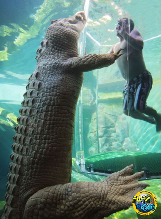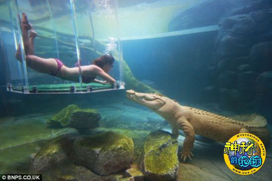 一条巨大的鳄鱼正在对有机玻璃箱中美丽动人的美女游客虎视眈眈。