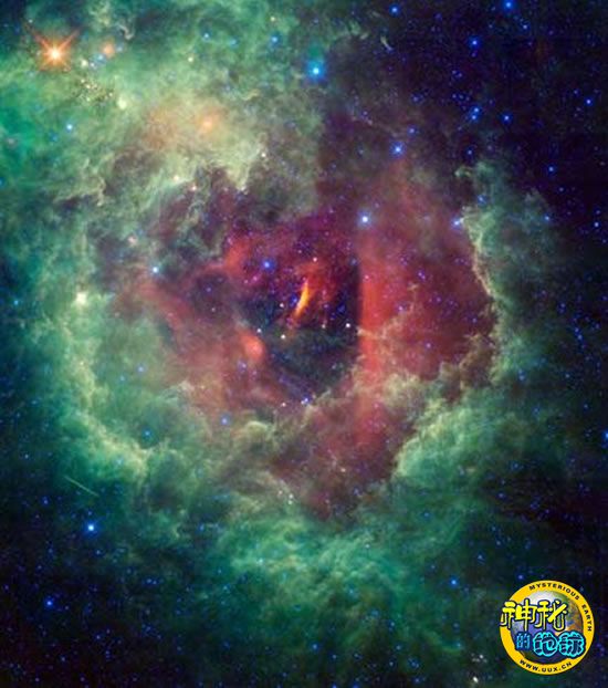 由广域红外勘测探测器(WISE)拍摄到孕育恒星的这个“玫瑰星云”,它位于银河系内的麒麟星座中。该星云也被称为“NGC 2237”,拥有麒麟星座中心区域最年轻的恒星簇。这些质量较大的恒星可产生大量的紫外线,并释放强烈的恒星风,侵蚀着附近的气体和灰尘。从而形成现今观测到的较大中心洞状结构。