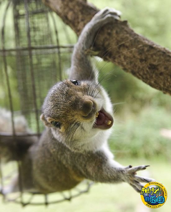 在你心目中,松鼠是不是一种可爱而温顺的小动物?如果是,那么下面这幅场景将是对你最好的反驳。这只灰松鼠牙齿暴露,爪子伸长,连它的小胡须也似乎充满了愤怒。