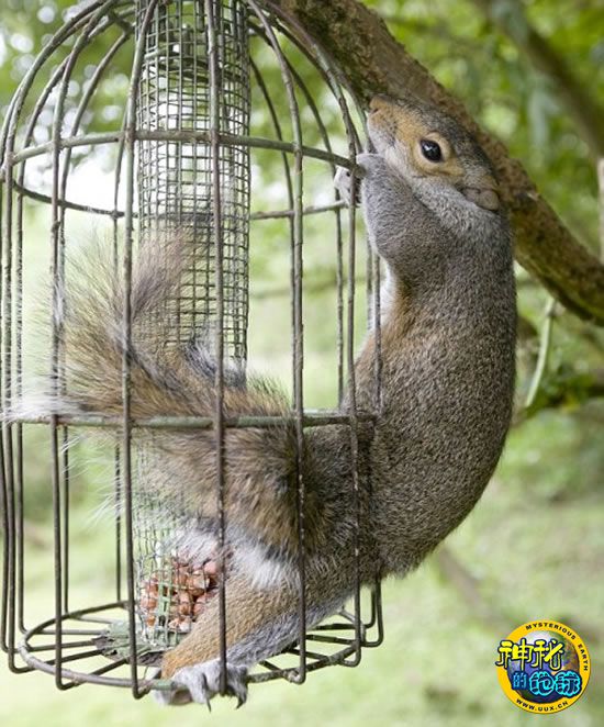 这种小动物这次爬进了一个人们专为鸟类设置的喂食器,并试图从中偷走坚果。但当它发现危险临近时,便立即转入战斗状态。