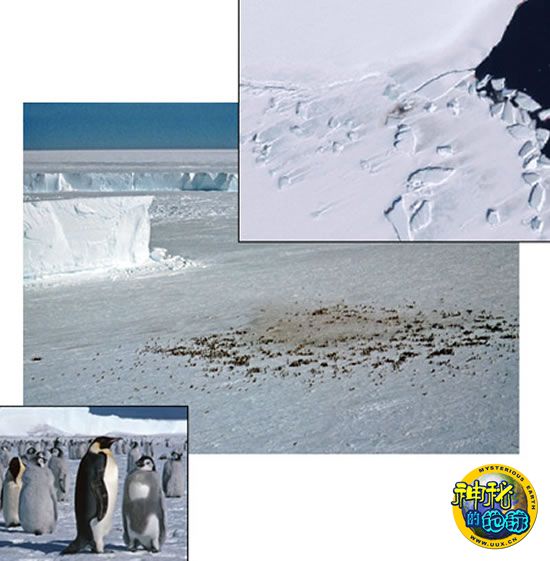 皇企鹅粪便在卫星拍摄的达恩利角的图像上也能够看到(上图),中图是一张在哈雷考察站附近拍摄的图片,下图则是皇企鹅种群。