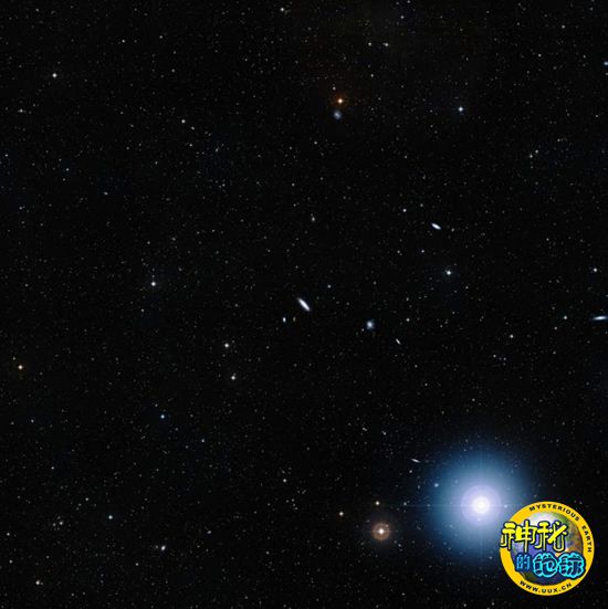 这张图像采用红、绿两色滤光镜数据合成,展示了NGC4666附近天区的情况。该图像构成数字化巡天2号项目的一部分。NGC4666位于图像中心位置。图像右下方那颗明亮的蓝色星球是著名的双星系统,室女座γ。整个视场大小约为3度。