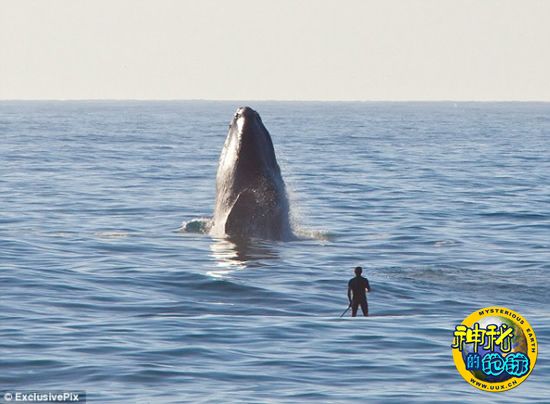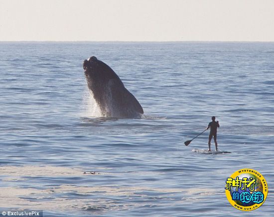 在南非西开普省游玩的立式单桨冲浪者亚克尔·欧姆看到一些南露脊鲸正在海岸附近玩耍,于是他决定抓住千载难逢的好机会,尽量靠近这些世界上最大的动物,与它们近距离邂逅。幸运的是,此时一只南露脊鲸也正好玩性大发,因此德国摄影师迈克尔·波里扎在距离海岸数百码的平静的海水里捕捉这一令人难以置信的场面时,他不用担心那只鲸会发现他。