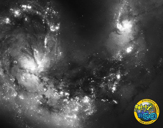 星系碰撞:当两个星系相撞, 如Antennae(如图所示),来自一个星系的匮乏金属的气体便会进入富集金属的星系中心,并冲淡后者。