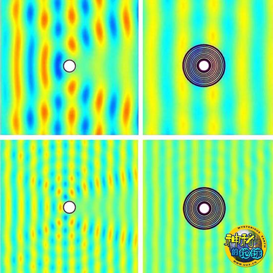 在一系列的模拟过程中,研究人员用等同于地震波的从30赫兹到50赫兹的标准频率轰击或震动这个环状物。结果显示,这个环状物能够在中央保护区的周围吸收这些波并改变其方向,而并没有对中央保护区构成影响。研究人员在2009年7月出版的《物理评论快报》上报告了这一研究成果。未来的建筑或许可以在其地基中融入这样一种地震“外套”装置,从而使其免遭在地表传播的地震波的破坏。