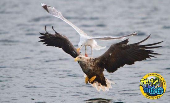海鸥空中伏击海雕抢食物