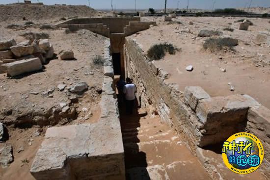 在古城Leukaspis,埃及文物学家在王室墓入口下楼梯进入古墓。