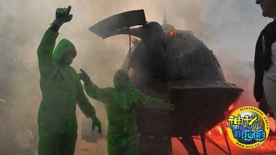 为了给“害羞”的外星人作出示范,当地人举办了一场模拟“第三类接触”仪式:一架由当地艺术家设计制造的“飞碟”降落在UFO机场,当舱门打开,化妆成外星“小绿人”的表演者走下舷梯,踏上地球土地,成为34年来这里的首批“外星来客”。