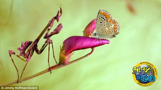 西班牙野生生物摄影师吉米-霍夫曼(Jimmy Hoffman)在自家后院捕捉到一组令人不可思议的螳螂特写镜头。在这组镜头中,螳螂看上去像是来自另一个星球的生物,它们能完全融入周围环境中,等待时机向猎物发起攻击。
