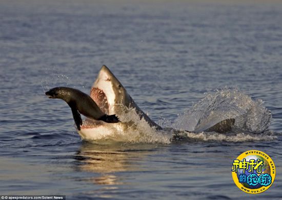 摄影师克里斯·法罗斯在南非开普敦福尔斯湾海豹岛近海目睹一只海豹鲨口逃生的惊险一幕,幸运的海豹把大白鲨的锋利牙齿当作支撑点,成功跳出鲨口,顺利逃走。