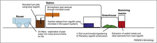 在地球上科学家已成功地利用细菌提取资源,全球25%铜资源就是使用细菌提取。这些细菌也可在其它行星实施类似的功能,从而制造返回地球的火箭发射燃料,或为自给自足型人类基地提供必需材料。科克尔和同事最初期望蓝细菌能够处理月球和火星上发现的岩石,他们测试了几种类型的蓝细菌,并将研究结果发表在《行星和太空科学》杂志上。一种叫做“Anabaena cylindrica”能够对所有类型的岩石进行采集,其中包括较高和较低硅含量的岩石。它们暴露在干燥的模拟火星环境中可持续存活28天。
