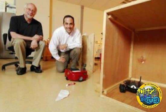 佐治亚州理工学院摄政董事教授艾金(左)和研究工程师瓦格纳(右)旁观两个机器人的“躲猫猫”实验。黑色机器人成功骗倒红色机器人,误认为自己藏在左手侧,而实际上,它却躲藏在右手侧。