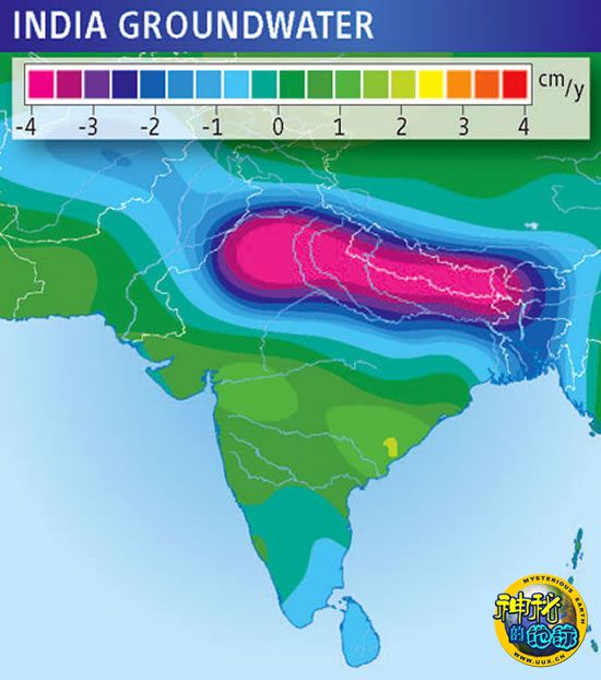 这张有关印度地下水的遥感测绘图(如图)来自于重力恢复与气候试验(GRACE)人造卫星项目——它由美国宇航局(NASA)同德国航空与航天中心合作,于2002年3月发射升空。事实上,这两颗相距220千米的卫星一前一后围绕地球运转。利用微波精确测量两个飞行器之间变化的距离,GRACE便能够发现地球引力的细微变化。