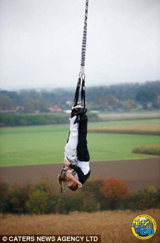 除了别开生面的典礼仪式外,这对新婚夫妇还尝试高空蹦极,倒挂在空中亲吻。