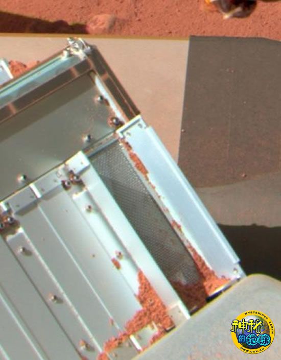 正在火星表面工作的热力与先进气体分析仪(TEGA)。机械臂上的铲子已经把火星土样放进一扇打开的门里,它附近的其他关着的小门,正在等待机械臂给它们传送样本。在前景位置可以看到盛放分光仪的箱子的一角,这个分光仪是用来分析火星的大气的。