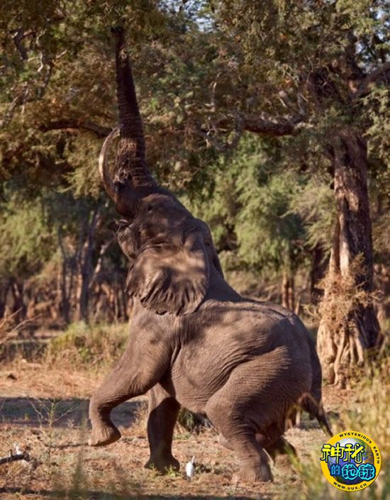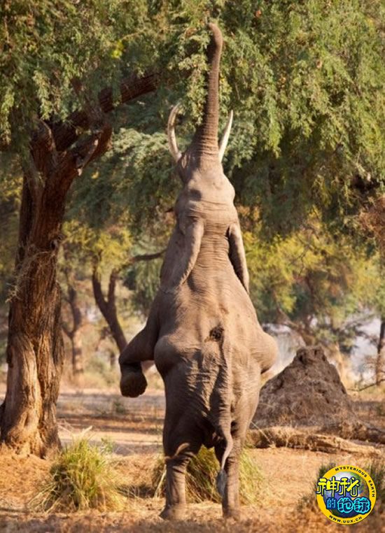 抬起前腿够取食物,这只大象展示了自己特殊的本领。看到一棵很高的树上垂悬着美味豆荚,这只大象并不沮丧。它没有简单地摇动树干,等着果实掉落地面,而是抬起前腿拉长身体用鼻子从树枝摘取豆荚。