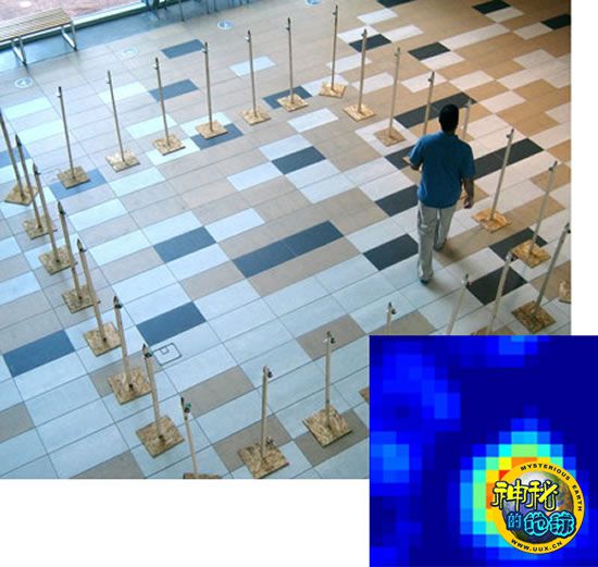 通过在计算机屏幕上显示一个人的位置(小图),一套无线电收发器阵列能够跟踪外来入侵者。