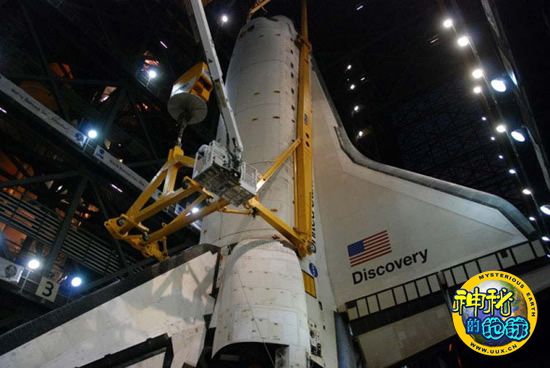 工程师将发现号航天飞机固定到位以便检测其燃料箱以及推进器,从而为2010年11月最后的飞行任务做准备。