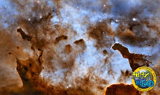 船底星云中的大质量恒星所产生的剧烈恒星风和辐射形成了这些柱状物和其他怪异的结构。在这幅太空照片中,这些浓密的结构可能是恒星托儿所,在那里有大量的新生恒星正在形成。这幅最新图片是一张合成图,是由“哈勃”太空望远镜于2005年对该区域的氢气光线的观测图像和最近对该区域的氧原子含量的观测图像结合而成。