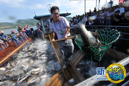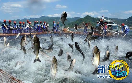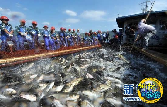 杭州千岛湖巨网捕鱼 来源: 神秘的地球 时间:2010年9月23日 09:39 9月21日,渔民和着号子慢慢收网,被包在网里的鱼纷纷跃出水面。 9月21日,渔民和着号子在千岛湖中心湖区收网。 9月21日,渔民从千岛湖中捞出一条30多斤重的包头鱼。 9月21日,一名女游客抱起一条30多斤重的包头鱼,体验渔民的收获乐趣。 渔民在杭州千岛湖中心湖区进行巨网捕鱼,20余名经验丰富的渔民耗时半个多小时收起一张巨网,捕获6万多斤鱼。 新华社发 上一篇 下一篇 TAG: 捕鱼 千岛湖