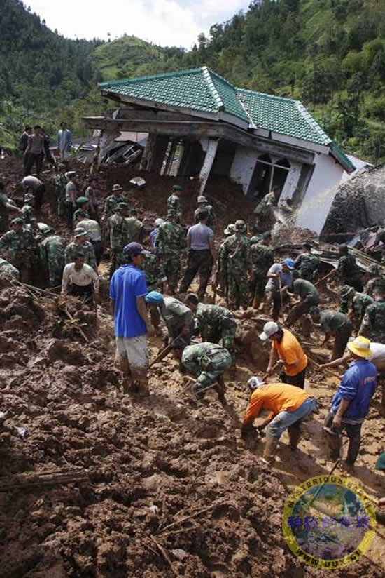 Rescuers search for victims at a village hit by landslides in Tawangmangu, Central Java, Indonesia, on Thursday, December 27, 2007.
