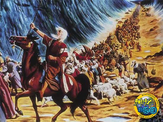 根据《出埃及记》记载,摩西带领以色列人逃离埃及,前有红海,后有法老的追兵。在上苍的帮助之下,彻夜东风吹出一条两边是水墙的安全通道。以色列人上岸之后,海水又回到原处,淹死了大批的埃及法老追兵。