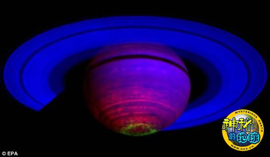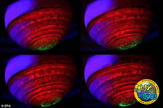 这张假色图由“卡西尼”号飞船在2008年11月11日拍摄的65张照片合成。土星南极周围的绿光类似于地球的极光现象