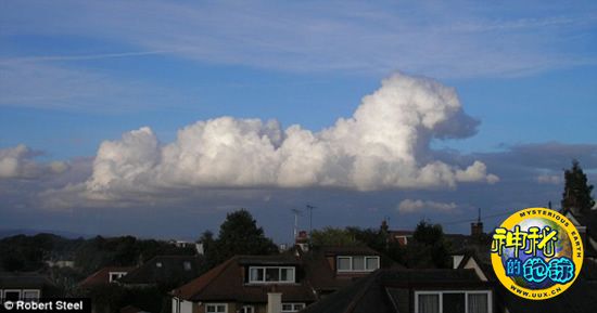 在奇异云团的另一次展示中,傍晚时分格拉斯哥基夫诺克小镇上空的云团形状与阿富汗猎犬极为相似。这张照片是由摄影师罗伯特·斯蒂尔拍摄的,那处云团在住宅区上空徘徊不去,看上去酷似一条狗爬在女主人脚下。