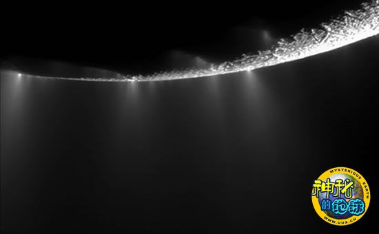 由那颗有环的巨大行星以及其他卫星的引力所产生的潮汐力在土卫二极度冰冻的表面形成了大量被称为“虎纹”的裂缝。巨大的引力同时还扭曲了土卫二的冰层,并产生了足够的热量,从而使这些冰水混合物能够喷出卫星表面的裂缝、进入太空。去年11月21日由卡西尼号探测器拍摄的这幅图像很可能预示着曾长期存在的间歇泉的终结。用不了很久,这一地区将在15年的时间里被来自太阳的阴影所遮蔽,从而使这些喷泉从卡西尼号探测器的视野中消失。