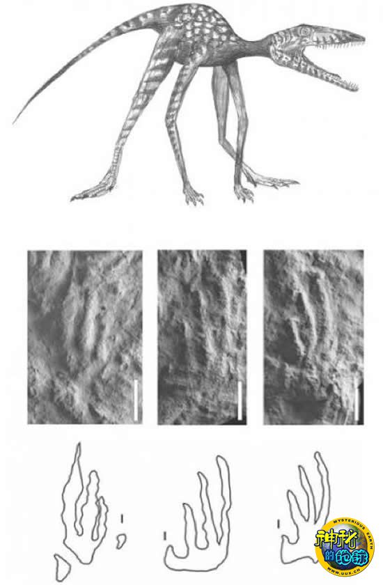Brusatte说:“这些恐龙脚印很独特,它有三个笔直的中央脚趾,成束分布而没有展开的足垫。”